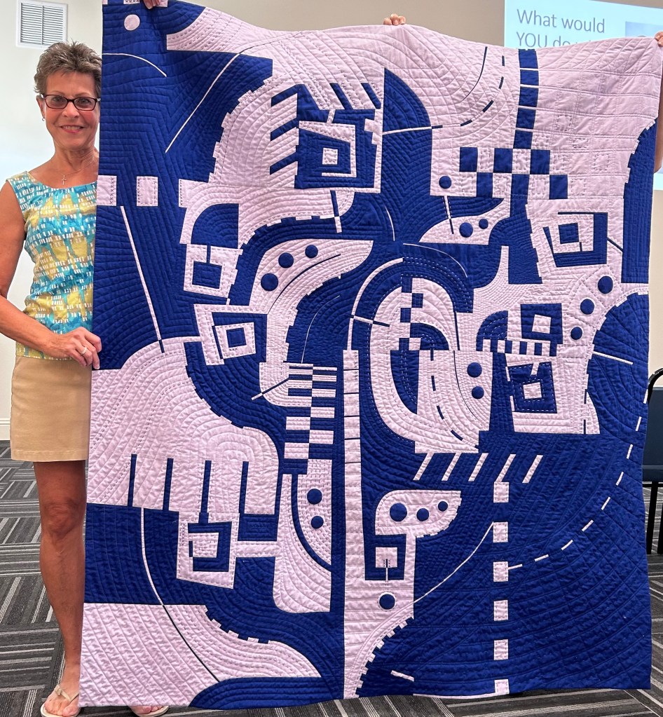 Linda shared this 57″ X 66″ improv quilt she calls Alternate Route. She began making it in April during a two-session virtual workshop with Irene Roderick @hixsonir. In the Two Step: Dancing with the Wall workshop, students were encouraged to work with only two fabrics, though one or two additional colors could be added.