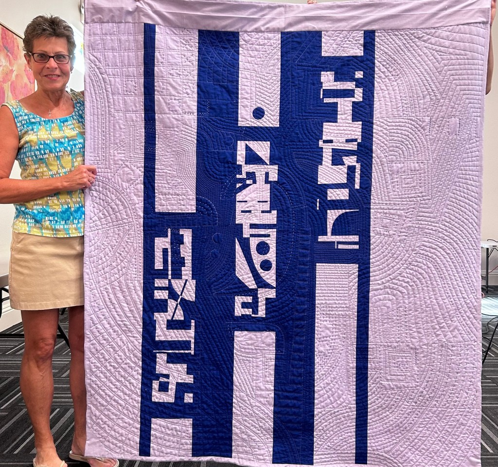 She used Patriot (blue) and Sachet (pale lavender) Painter’s Palette solids to machine piece her quilt. Leftover blocks and fabrics were used to piece a backing. Domestic machine quilting was done on her Bernina 770QE. Big stitch hand quilting was added using size 8 perle cotton and six-strand embroidery floss.