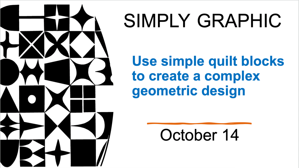 On Saturday morning, October 14 ,10 AM at New Life Christian Church (Wildwood), our meeting program is Simply Graphic, where we’ll learn ways to make a simple quilt block into a graphic design.