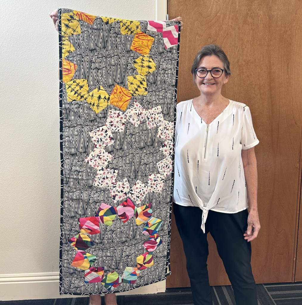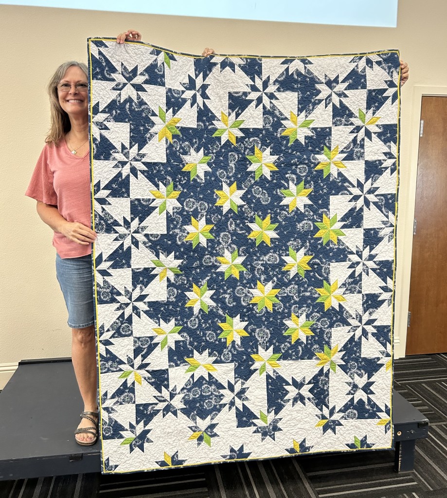 Cindy @cbubblesnsews shared a 65″ x 72″ quilt called Blowing Dandies, made using the Hunter’s Star Ruler by Deb Tucker. Cindy free-motion quilted this on a domestic machine.