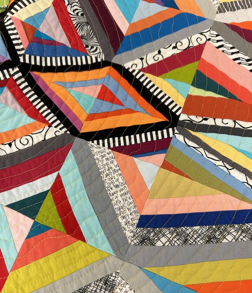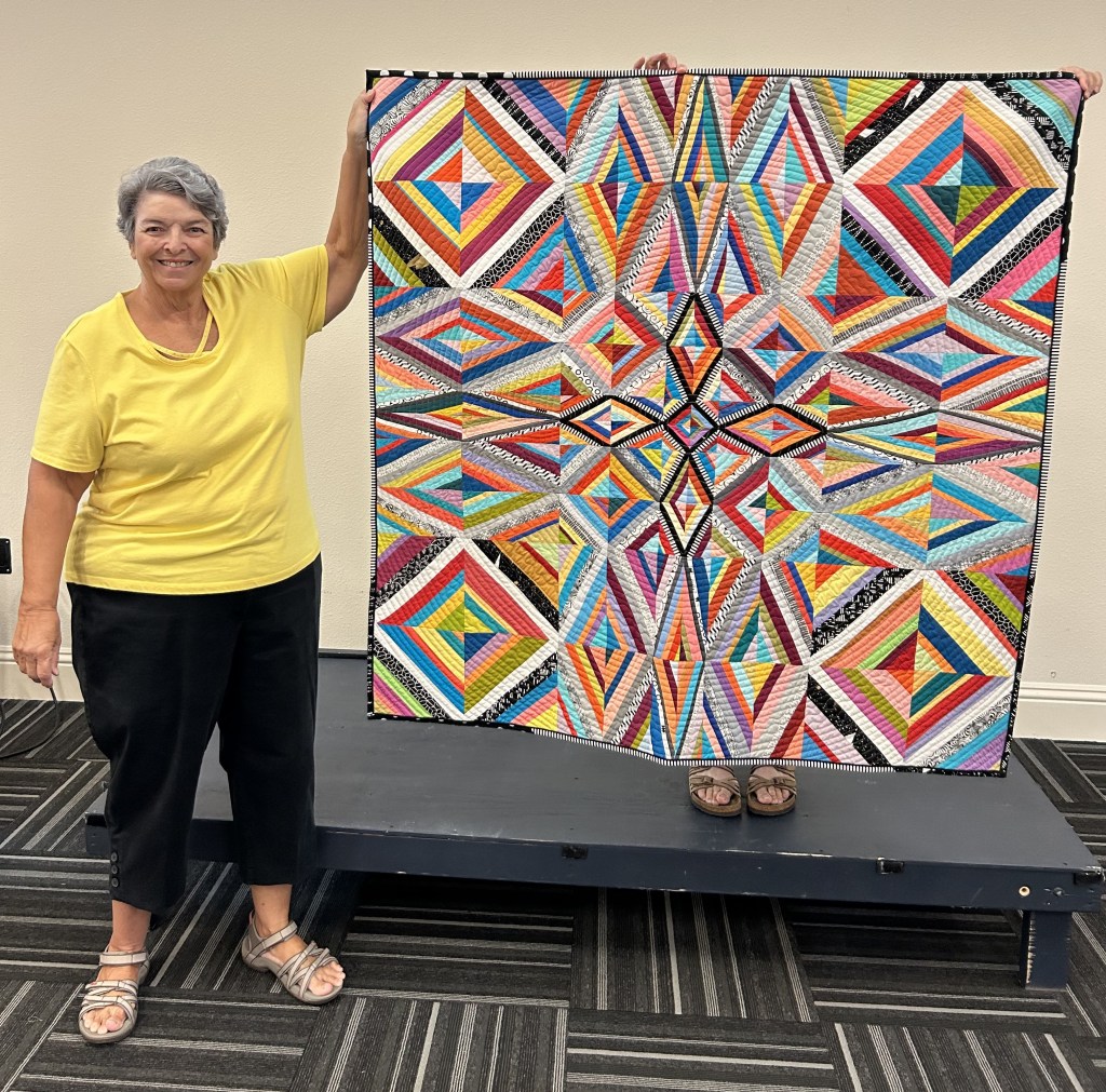 Beth @bluedragonfly5 shared Illusions, a 52″ x 52″ quilt of original design. Beth created her design on EQ8, altering a grid to create different-sized blocks. She quilted it using a walking foot on a Viking Sapphire domestic machine, creating a spiral pattern. Illusions has wool batting and a corded binding.