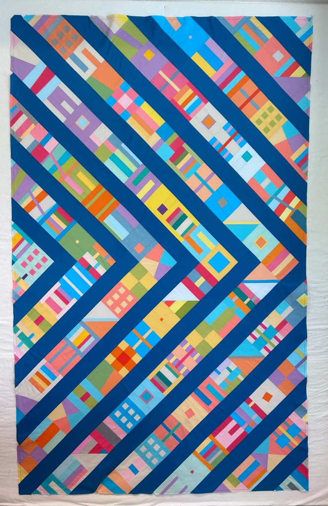 This is the “arrowhead” layout of Linda’s Summer Camp Modern Mystery Quiltalong top for which she pieced the backing.