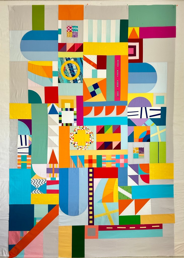 I used several orphan blocks from the Summer Camp Modern Mystery quilt along (see in center), and some Dreamlines components, among other bits. Yep, I fizzled-out on Dreamlines after several months. Making this backing was a good exercise for me because I unearthed more orphan blocks and parts than I expected! Now I’ve found enough parts for at least two more large quilt backs!