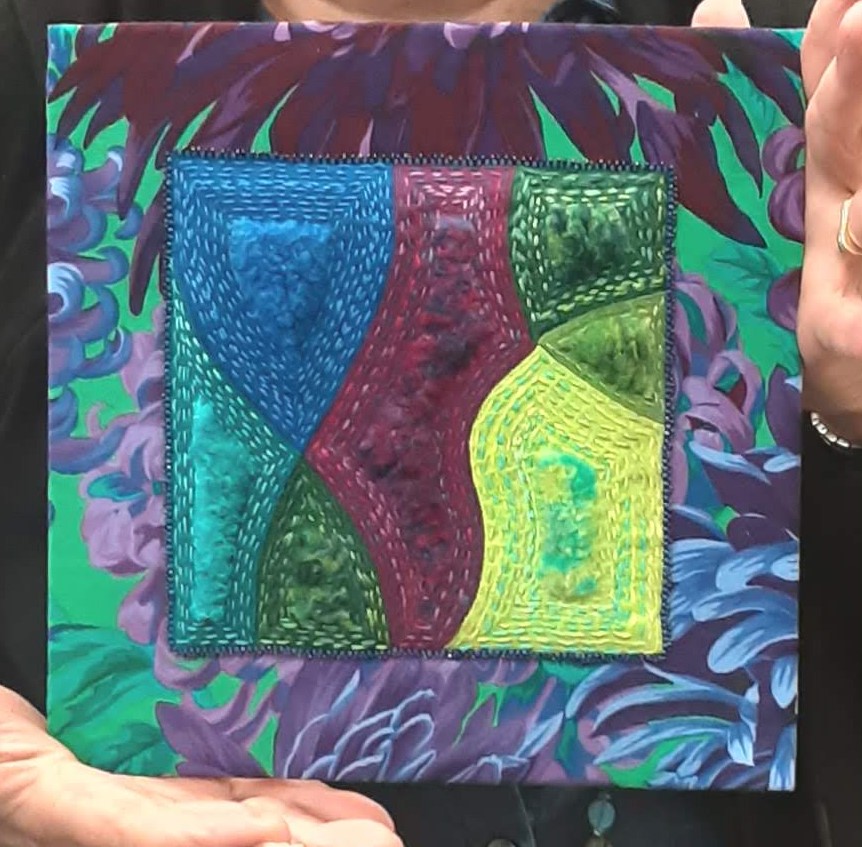 Irene @riedmanirene was inspired by a class with Carolina Oneto @carolina_oneto to create this 8 by 8 piece of art. She utilized Sashiko embroidery work to create the detail for her version of Aurora Borealis.