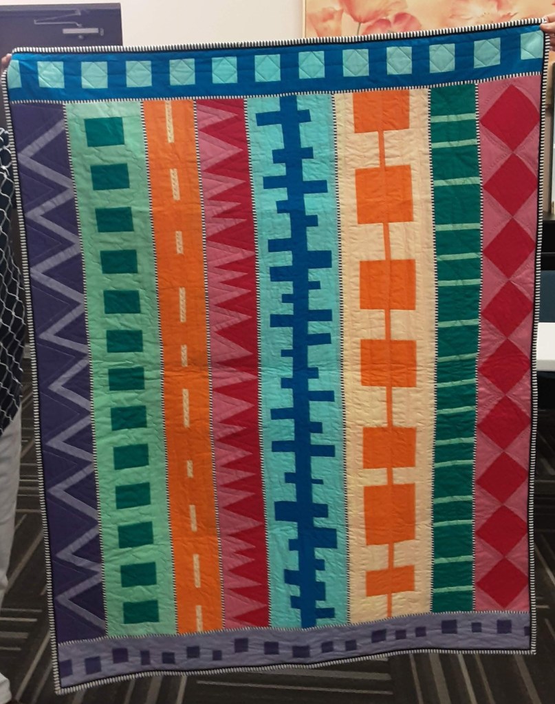 Beth shared her version of Dream Lines, also created during the Brenda Gael Smith 2023 Improv Challenge. This was walking foot quilted and as part of the 100 day challenge, she used regular and decorative stitches to accomplish the machine quilting on her Viking Sapphire. It measures 42 by 54. As part of the Modern Quilt Guild “Use It” Scrap Challenge in 2023 (October to December), Beth pieced her back to Dream Lines, shown below. Beth’s quilt back was one of ten prize winners of Hobb’s batting.