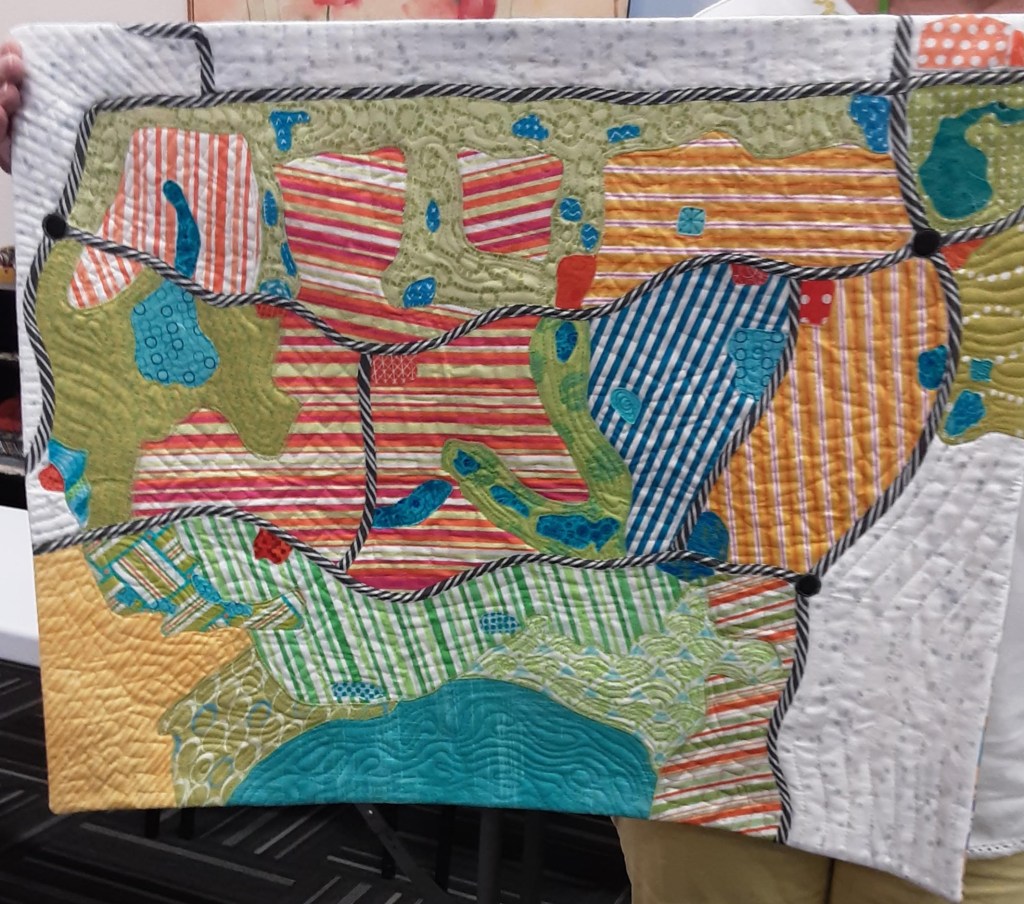 Linda H @flourishingpalms shared her home map called My Area created during a virtual workshop with Timna Tarr @timnatarr “Making Maps.” It measures 19.5 by 24.5 and Linda used a Clover bias tape maker – the 1/4″ size. Fabric was fused to the background and then quilted in place.