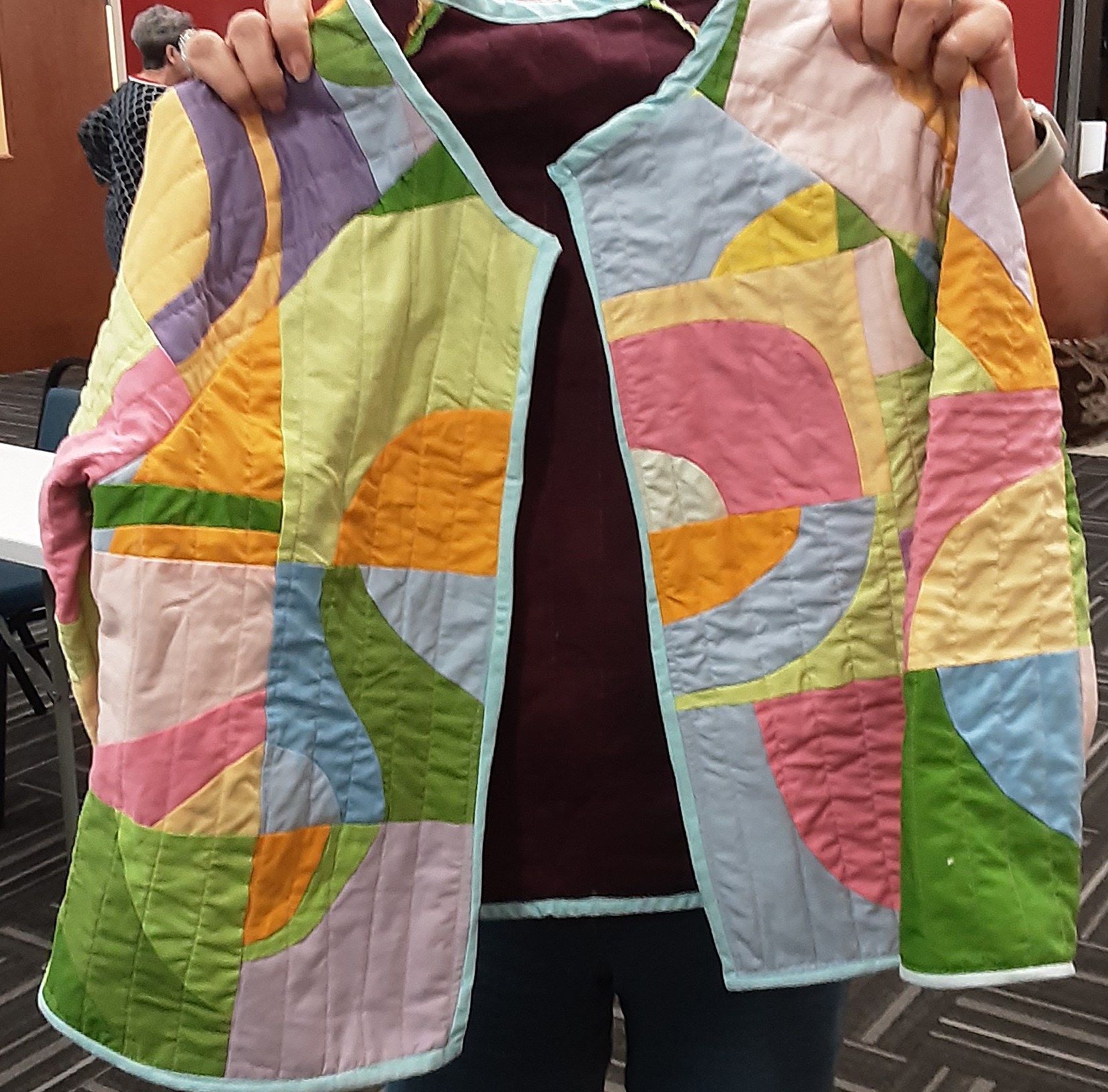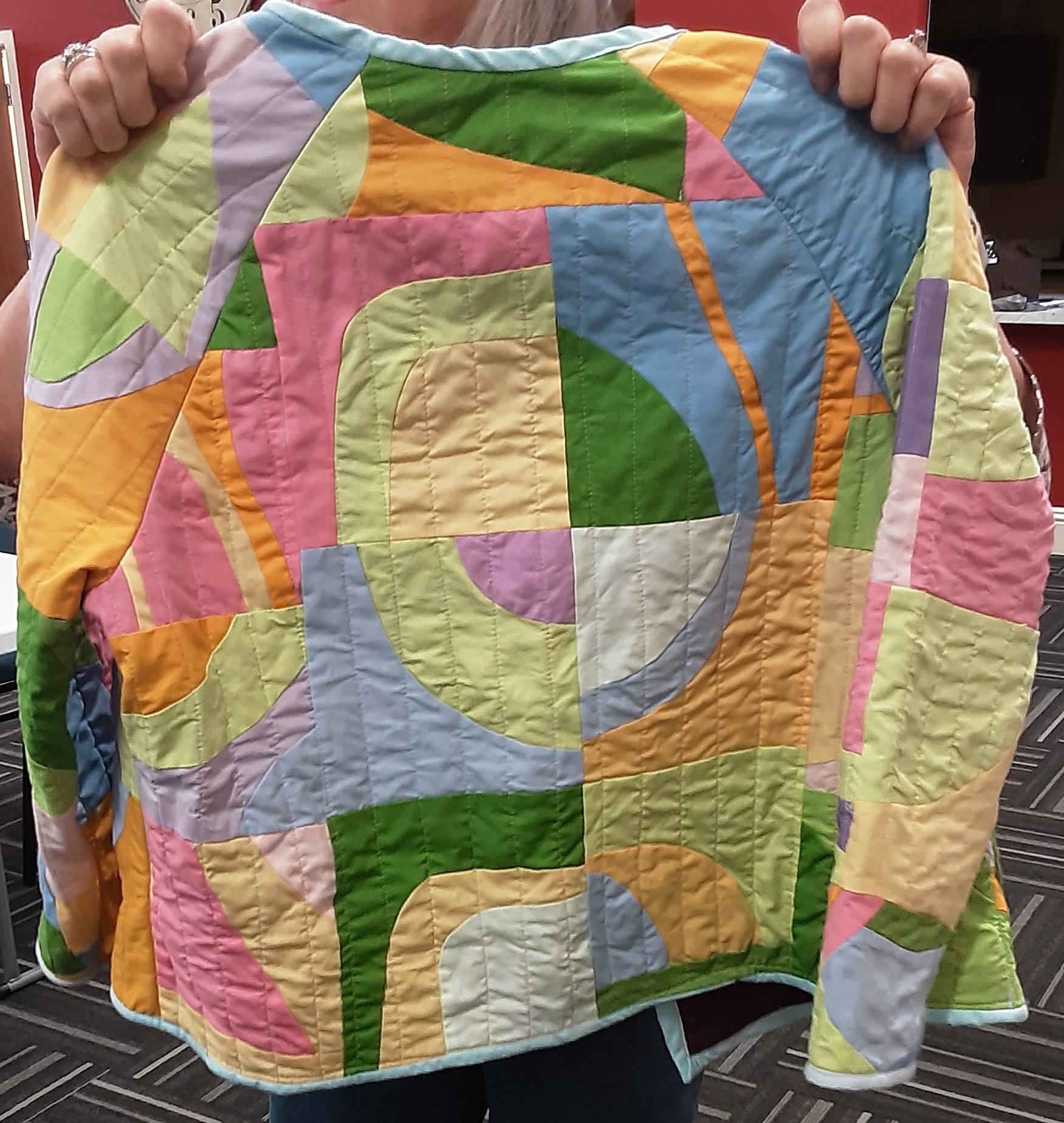 Bonne B @bonniequiltsaway participated in a “Fearless Improv Curves” class with Cindy Grisdela @cindygrisdela and used her blocks to make a quilted jacket for her granddaughter. The jacket is quilted to a sweatshirt using Edyta Sitar’s Beachcomber Jacket pattern.