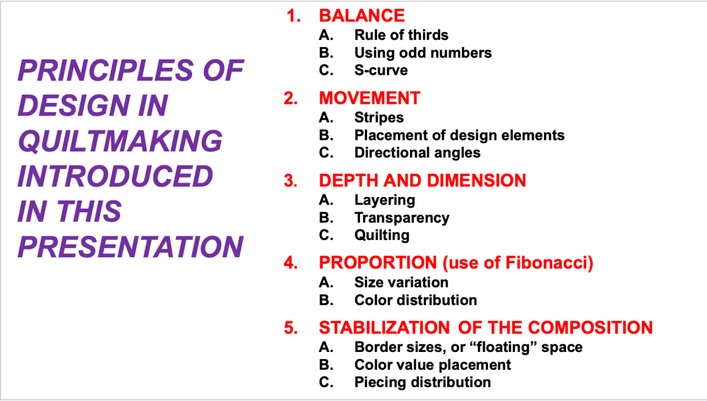 After you’ve reviewed quiltmaking principles that were shared, the page below encapsulates everything that’s been covered.