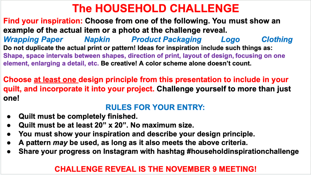 At our April 13 meeting, Karen E presented a program called “Principles of Design in Quiltmaking.” Members who were unable to attend the meeting may view the presentation here, in the Member’s Only section of this website.