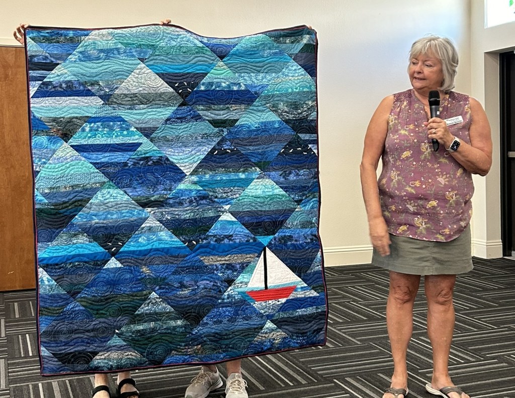 Bonnie B @bonniequiltsaway shared a quilt called Seafarer, which she foundation paper pieced using scraps. Bonnie quilted this on her longarm.