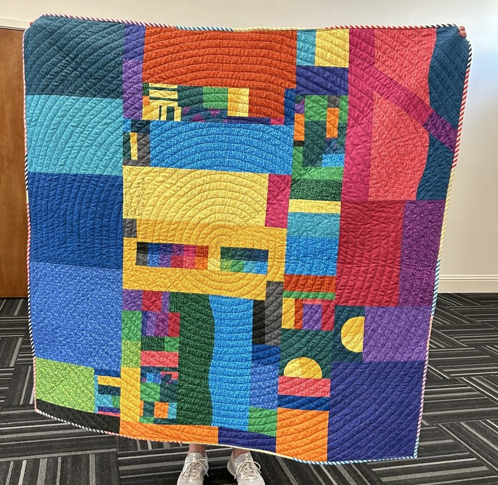 Rosemary V @franticquilter shared Lilly Sharpe, measuring 52″ x 52″ and made during the Modern Quilt Studio Secret Agent Mystery Quiltalong. This quilt features transparency and was made Benartex fabric. Rosemary improv pieced leftovers to create the back, including the code used to create the front. She quilted this on her Husqvarna.