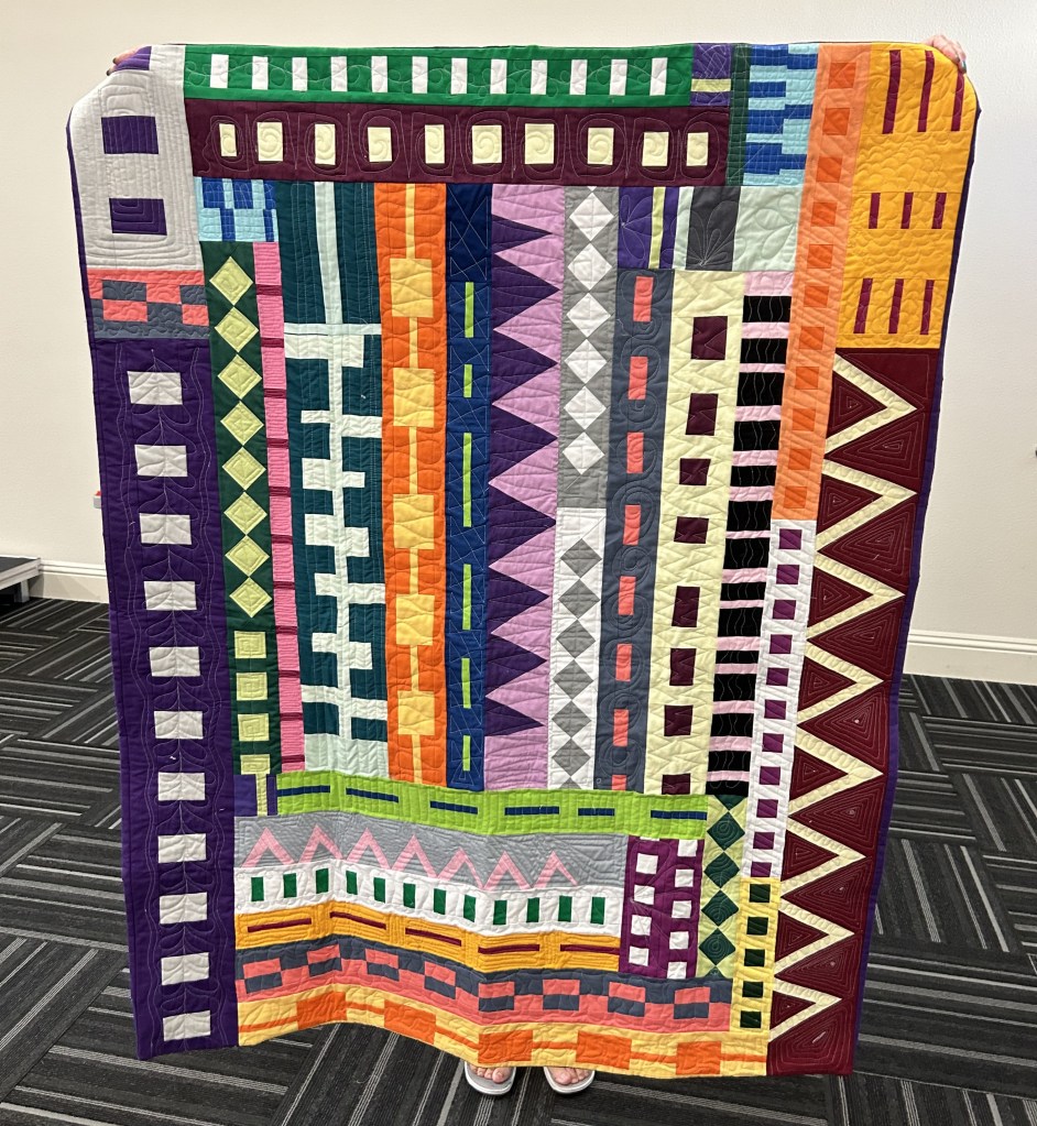 Donna P @donnapquilts shared a 60 x 78″ quilt called Family Jewels. Donna began this quilt as part of our 2023 CFMQG Challenge. She used the Diamonds on Display quilt pattern by Heather Black @quiltachusetts and a Bloc Loc Half-Rectangle Triangle ruler. Donna quilted this on her domestic Brother and sashiko machine, using rulers and artist painters’ tape.