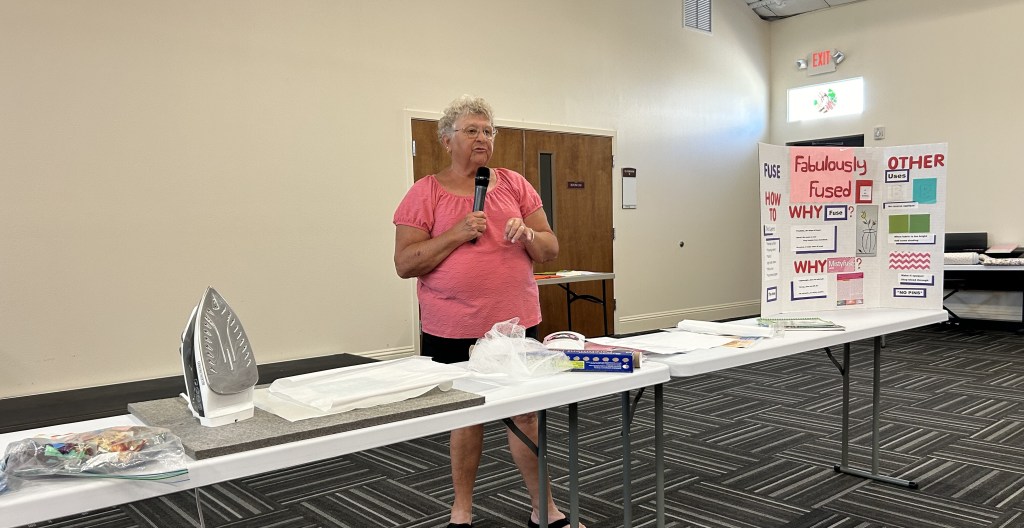 Betty S presented the program, Fabulously Fused. Betty used information from Sue Bleiweiss’ Fabulously Fused Modern Quilts webinar (available in the MQG Resource Library) and shared different fusible materials and ideas for how to use them in modern quilts. The presentation heavily featured the product Mistyfuse, and Betty followed her program with an opportunity to test this product on sample swatches.