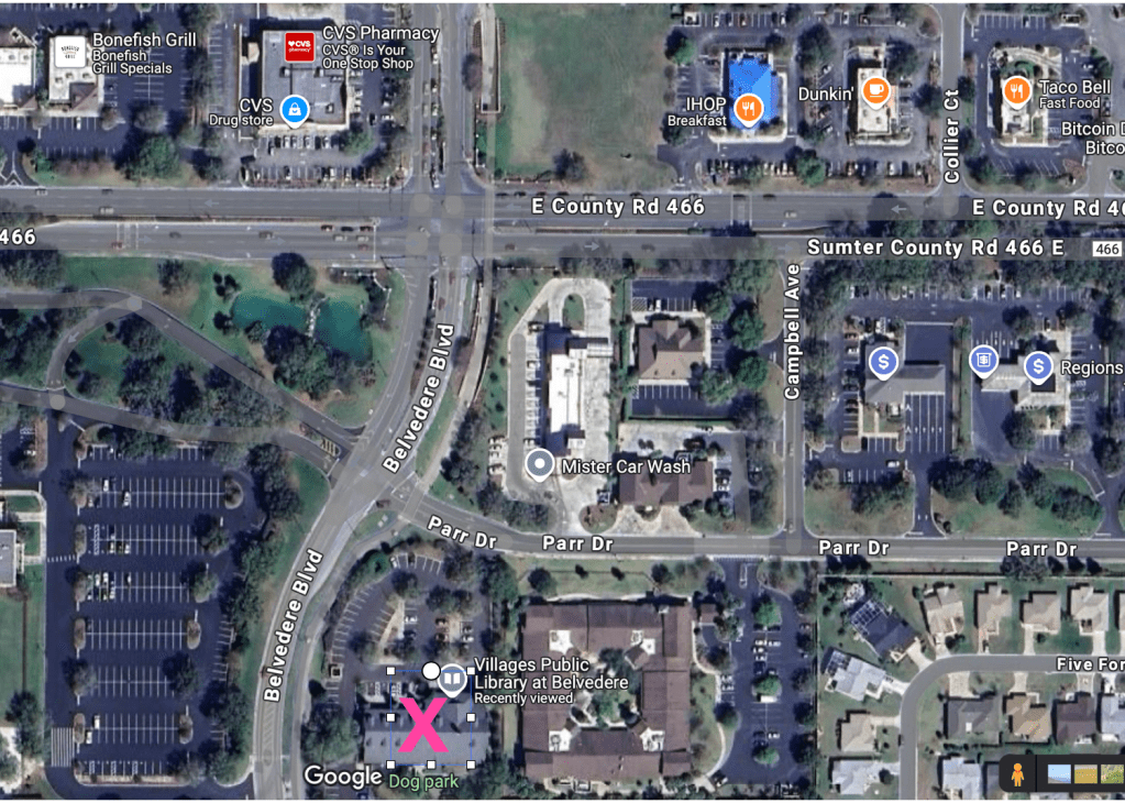 The library is south of East County Road 466, at the corner of Parr Drive and Belvedere Boulevard.
