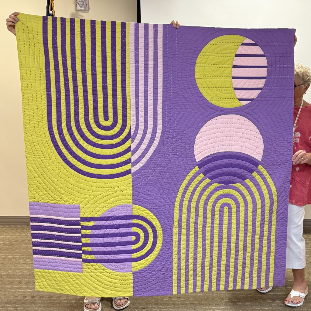 Program Coordinator Mel T will be presenting August’s program, on sewing hacks. Mel shared that Lora D will be presenting in September about applique, and Linda H will be discussing quilt photography in October. Shloe K will be leading November’s challenge reveal, and the December meeting will be our holiday party at Betty’s house.